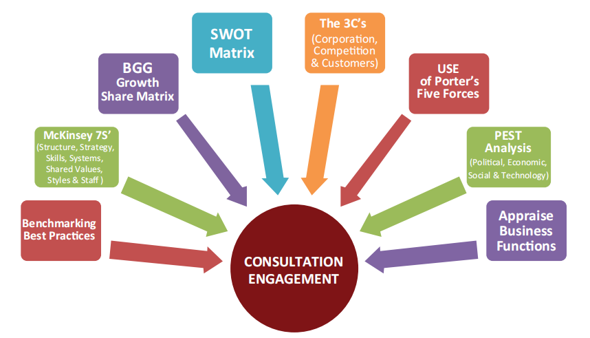 We employ international recommended frameworks for consulting and use tools to deliver key tasks efficiently. These tools guide us to achieve intended goals through strategic plans as requested by our clients. In so doing our frameworks help our clients to analyze a business trend performance and overcome any unforeseen factors that might prevent succeed in the long run